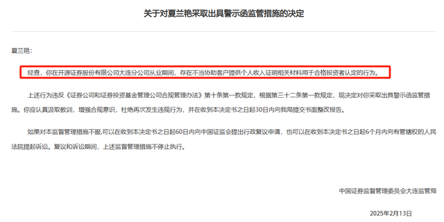 夏兰艳在开源证券大连分公司从业期间,存在不当协助客户提供个人收入证明相关材料用于合格投资者认定的行为。