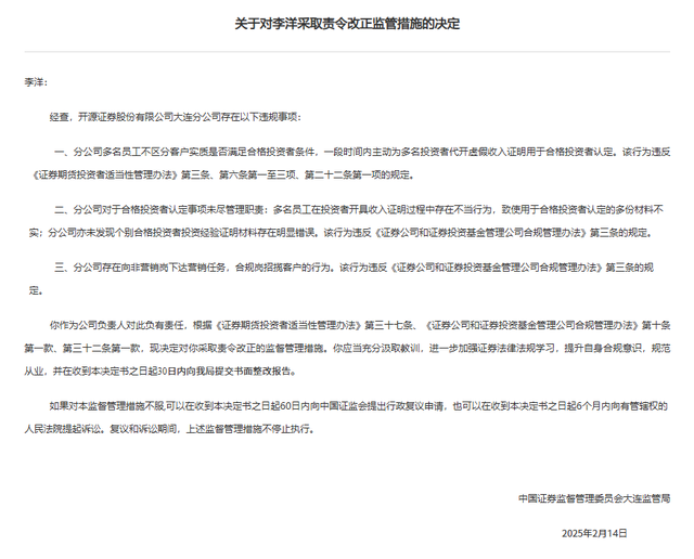 大连证监局指出,上述行为反映出开源证券大连分公司内部控制不完善、存在较大风险隐患。李洋作为公司负责人对此负有责任,应当充分汲取教训,进一步加强证券法律法规学习,提升自身合规意识,规范从业,并在收到决定书之日起30日内提交书面整改报告。