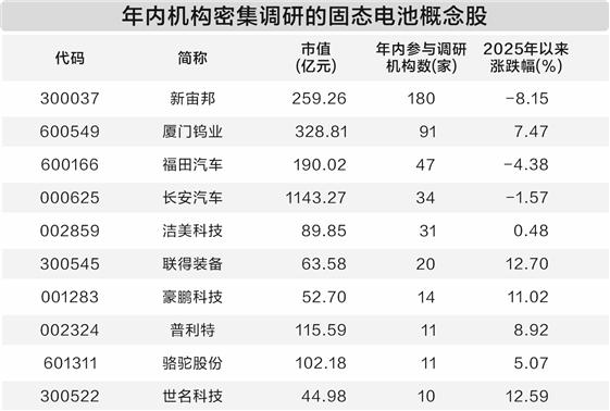 上述180家公司中,年内获得10家及以上机构调研、股价涨幅低于15%且2024年业绩为非亏损状态的公司有10家。新宙邦调研机构数量最高,获得180家机构调研,股价年内跌幅超过8%,公司在固态电解质领域的研究投入多年,专利申请累计超过30件。
