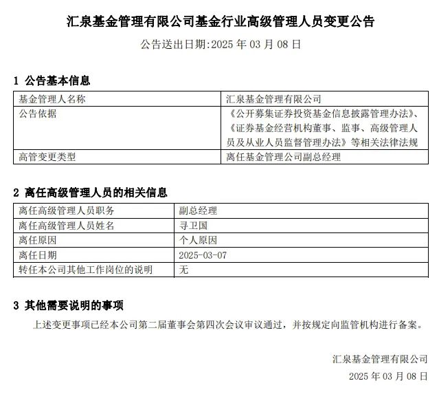根据汇泉基金公告,于今年3月7日因个人原因离任的副总经理寻卫国,目前无转任公司其他工作岗位。