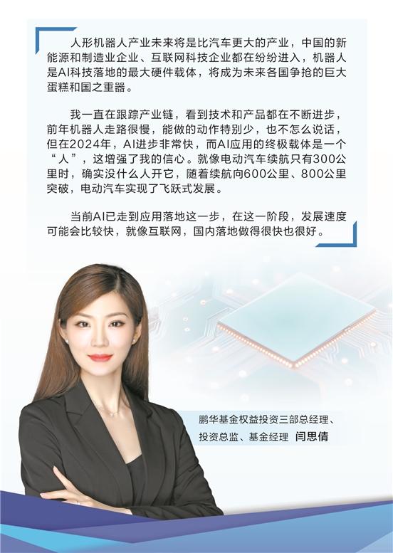 闫思倩:2022年,一些国内汽车产业链上的公司开始布局人形机器人,2023年这些公司陆续公告了在人形机器人领域的扩产和布局情况,2024年,它们在技术上出现大幅突破,前景越来越清晰,我也开始调整持仓,加大对人形机器人的布局。从科技和制造业发展空间来看,机器人是AI科技落地的终极产品,而制造业发展空间过去最大产品是汽车、手机,未来将是机器人,可以是几十万亿元的产值。