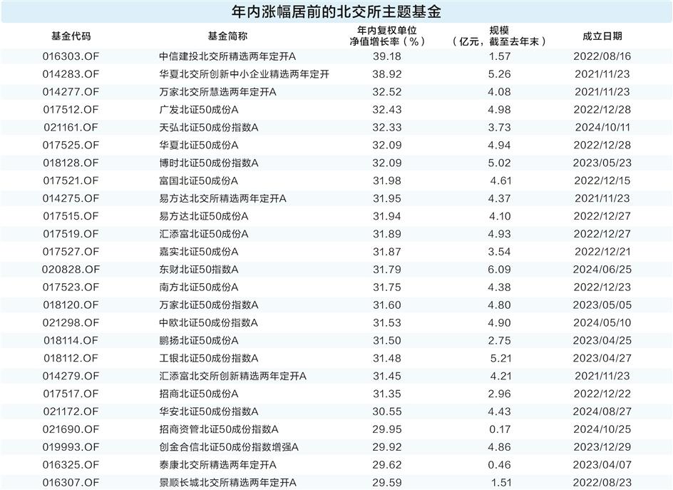 中信建投北交所精选两年定开A、华夏北交所创新中小企业精选两年定开、万家北交所慧选两年定开A年内涨幅居前,均超过32%。