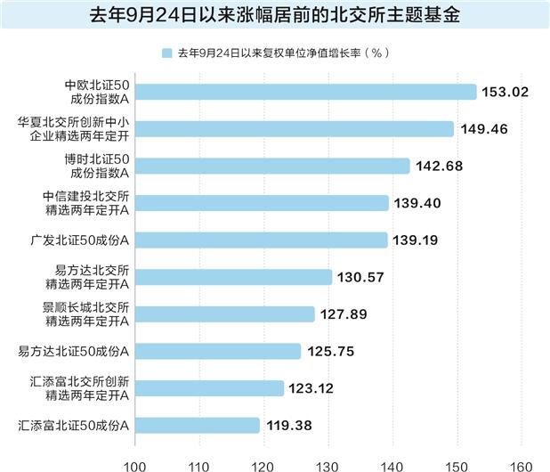 北交所板块自去年“9·24”行情以来持续走高,北证50指数累计涨幅已达到131.97%,最新点位再次逼近去年的历史高位。北交所主题基金同样取得不错的收益,数据显示,北交所主题基金“9·24”行情以来平均上涨116.78%,24只基金实现复权单位净值翻倍。