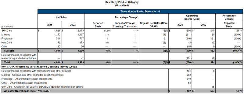 皮肤护理业务净销售额下降12%,亚太市场持续承压