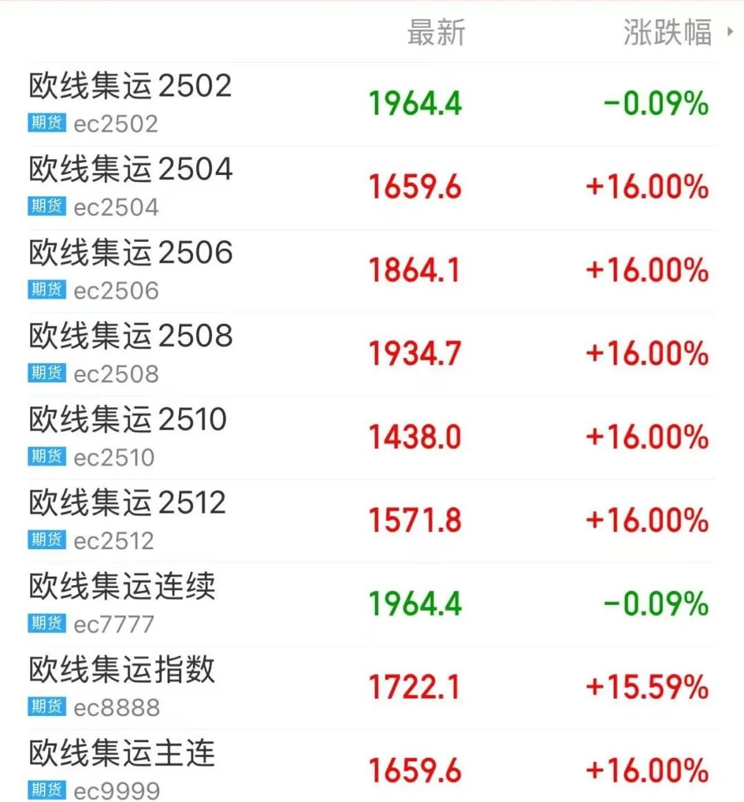 2月7日,集运指数(欧线)期货几乎全线涨停,除进入交割月的EC2502合约外,包括主力合约在内的5个合约均出现涨停。分析人士普遍认为,受基本面涨价预期与地缘政治因素影响,集运指数(欧线)期货全线大涨。
