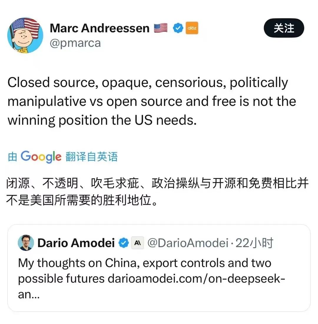 虽未直接点名,但DeepSeek正是以开源及免费,在全球AI开源社区中受到普遍认可,而Anthropic开发的Claude模型与OpenAI的GPT模型一样,均属于闭源模型,训练过程及技术细节不对外公开。MarcAndreessen的评论也是在暗讽DarioAmodei,作为AI行业的领军人物,却企图利用地缘政治来遏制对手,否认开源工作,与实现通用人工智能目标的初衷已经背道而驰。