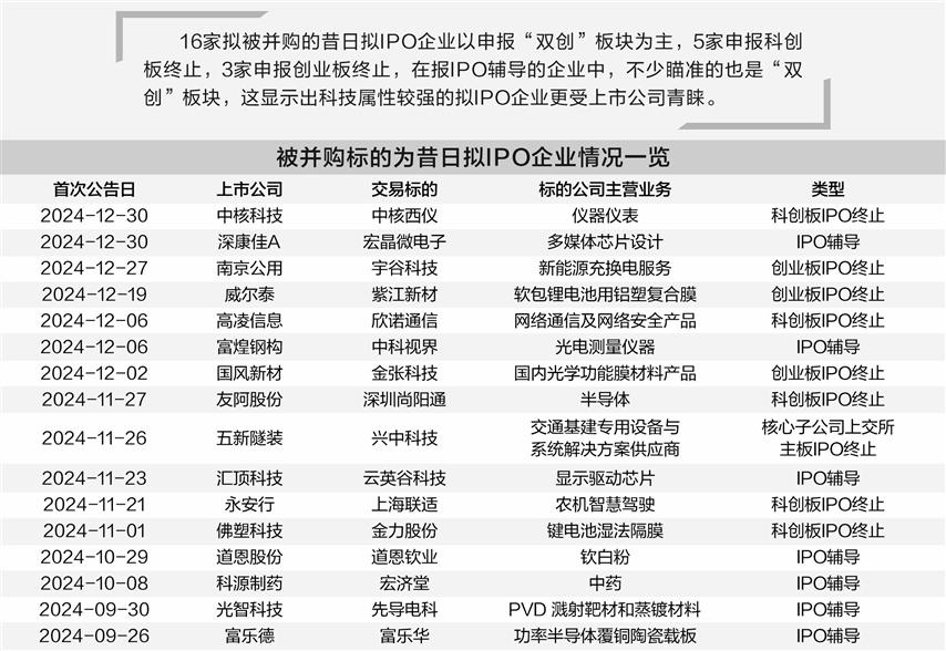 A股上市公司并购越来越青睐昔日拟IPO企业。证券时报记者不完全梳理发现,截至2024年年底,“并购六条”发布以来首次公告的重大资产重组及发股收购项目为57单,被并购标的为昔日拟IPO企业(包括IPO撤单和IPO辅导终止)达16单,占比近三成。