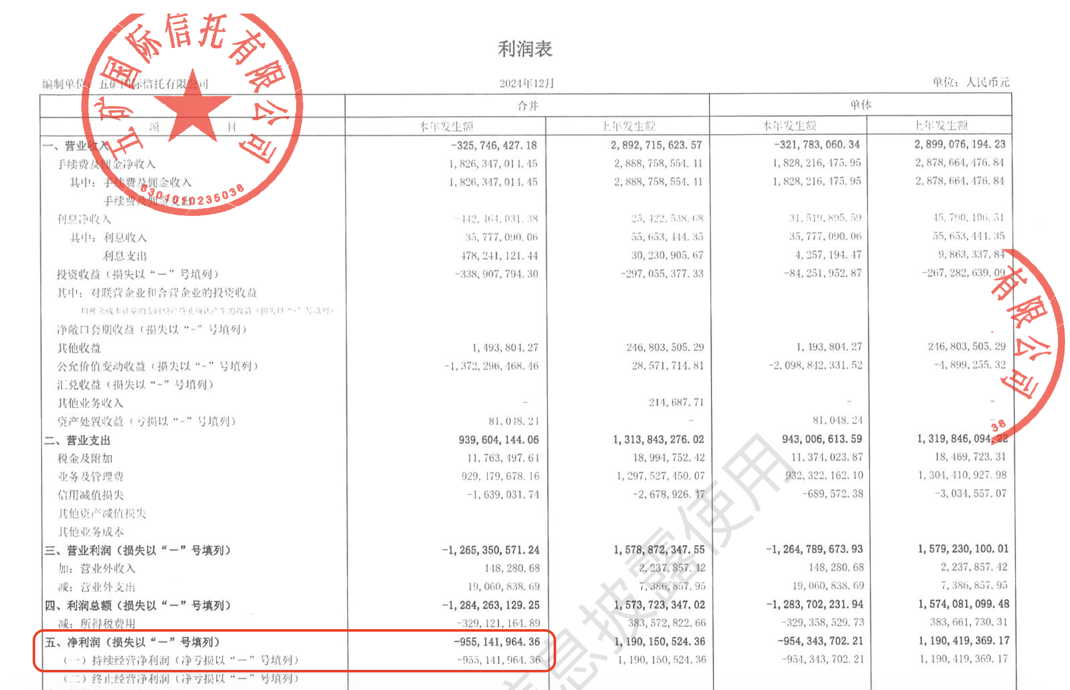 其中,五矿信托2024年营业收入为-3.26亿元,净利润为-9.55亿元,上年同期为11.9亿元。手续费及佣金收入为18.26亿元,利息净收入为-4.42亿元,投资收益为-3.39亿元,公允价值变动收益为-13.72亿元。