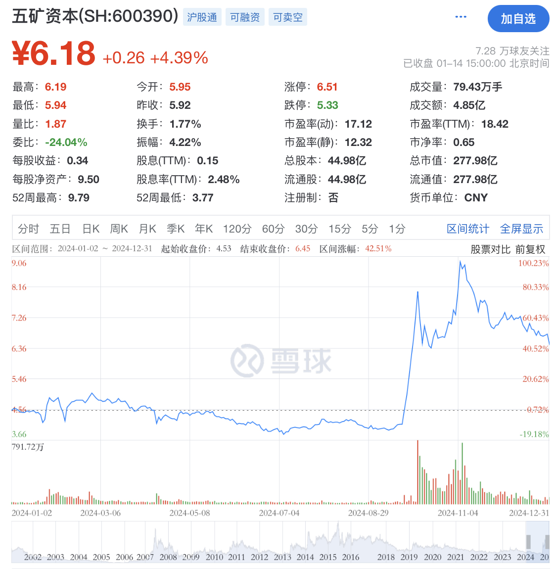 截至1月14日收盘,五矿资本报6.18元/股,总市值277.98亿元。该股去年9月下旬股价大幅拉升,11月中旬开始有所回落,全年涨超42%。
