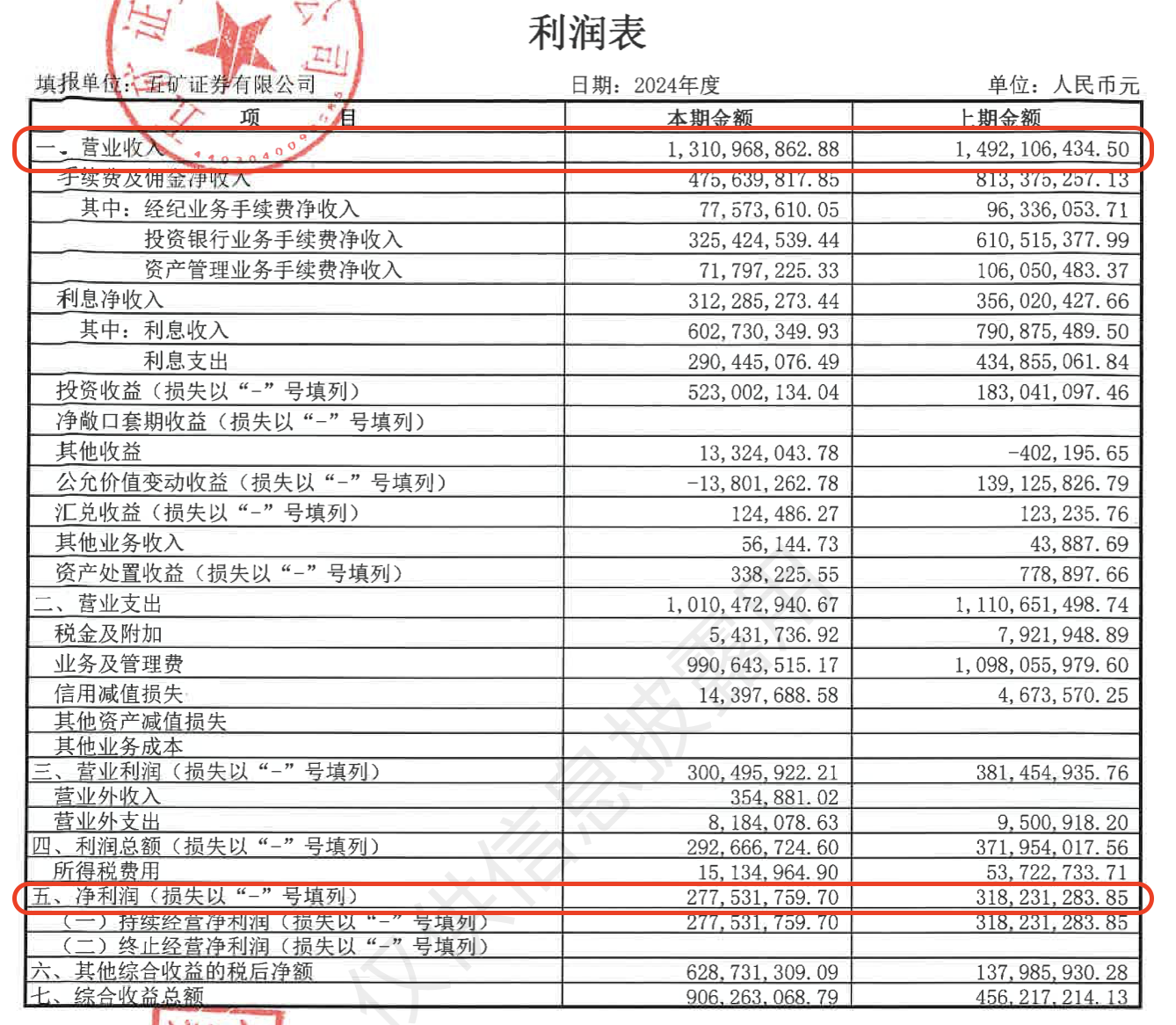 此外,五矿证券2024年营收净利较2023年也双双下滑。
