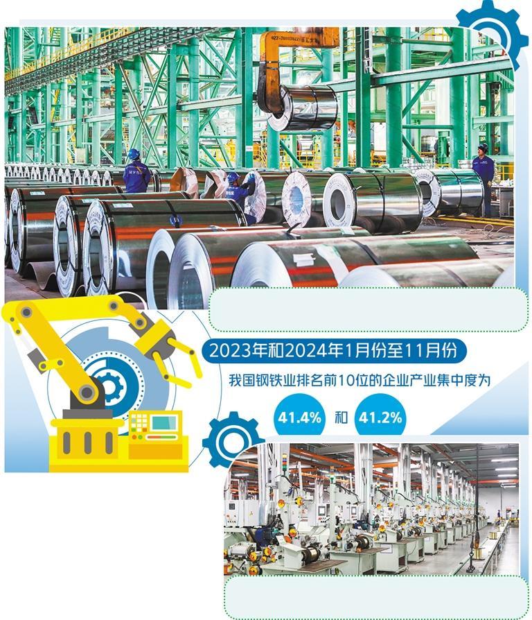相较之下,我国钢铁企业现仍处于过度分散状态。2023年和2024年1月份至11月份,我国钢铁业排名前10位的企业产业集中度(CR10)仅为41.4%和41.2%。
