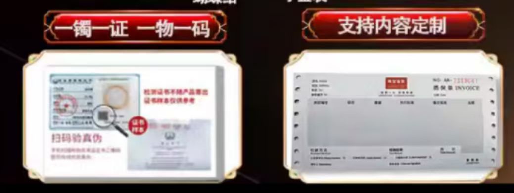 能提供产品证明的不光有线下门店,在电商平台上,售价百元的金包银手镯不仅提供所谓的鉴定证书,还能配备知名品牌首饰盒。“如果需要的话,还可以开票,上面的内容支持定制。”