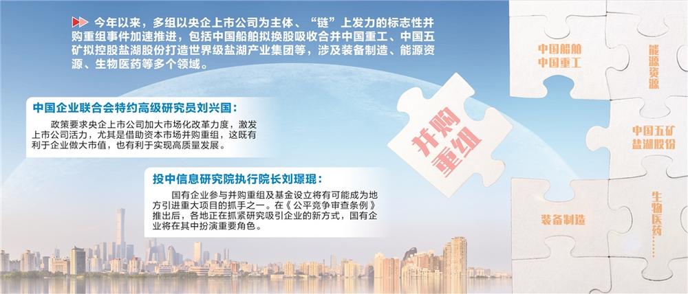 今年以来,多组以央企上市公司为主体、“链”上发力的标志性并购重组事件加速推进,包括中国船舶拟换股吸收合并中国重工、中国五矿拟控股盐湖股份打造世界级盐湖产业集团等,涉及装备制造、能源资源、生物医药等多个领域。相关统计显示,今年A股上市公司披露的重大资产重组中,国资国企并购活跃度大幅提升。