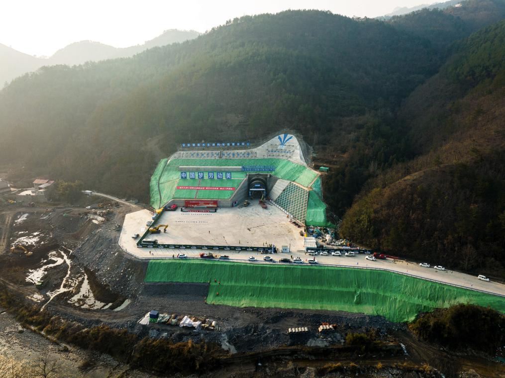 2024年1月8日,在湖北省襄阳市保康县马良镇拍摄的引江补汉工程输水隧洞8号平洞施工现场(无人机照片)。新华社记者肖艺九 摄