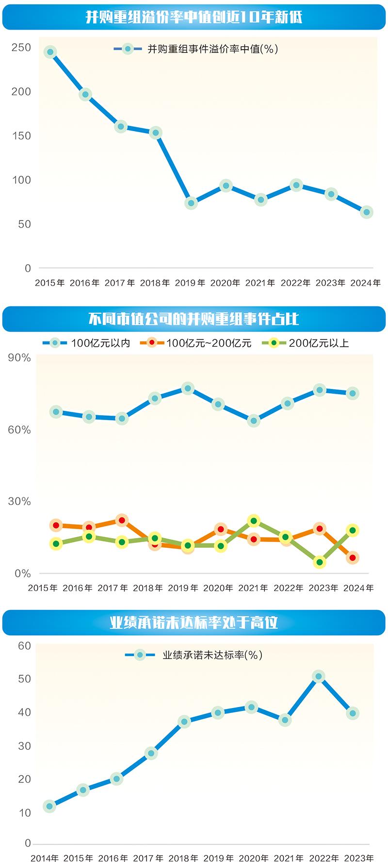 一是溢价率高。例如,精研科技收购瑞点精密、新华锦并购上海荔之时的溢价率分别高达829.84%、660.28%,2023年业绩完成率分别为44.2%、83.94%,均未达标。