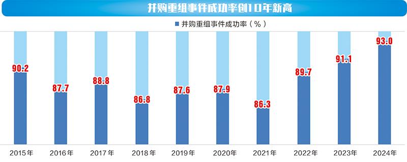 据证券时报·数据宝统计,截至12月中旬(下同),以首次公告日(下同)为统计口径,2024年以来并购方为上市公司且处于完结状态的并购事件有541起(仍在进行中的有1533起),目前仅38起失败,并购成功率达93%,较2023年提升1.9个百分点。拉长时间来看,2015年以来A股公司累计完成的并购事件达1.28万起,近三年并购成功率持续提升,2024年该比例已创近10年新高。