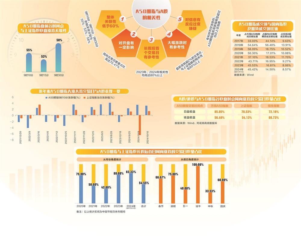 比如,2022年3月9日,A50期指9时10分下跌4.3%,同日沪指仅下跌1.13%;2022年10月25日,A50期指9时10分下跌3.58%,沪指仅微跌。2024年10月10日,A50期指9时10分涨3.1%,沪指同日涨1.32%。