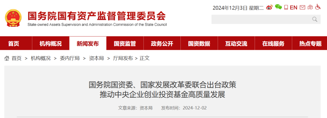 近日,国务院国资委、国家发展改革委联合出台政策措施,推动中央企业创业投资基金高质量发展,支持中央企业发起设立创业投资基金,重点投早、投小、投长期、投硬科技。