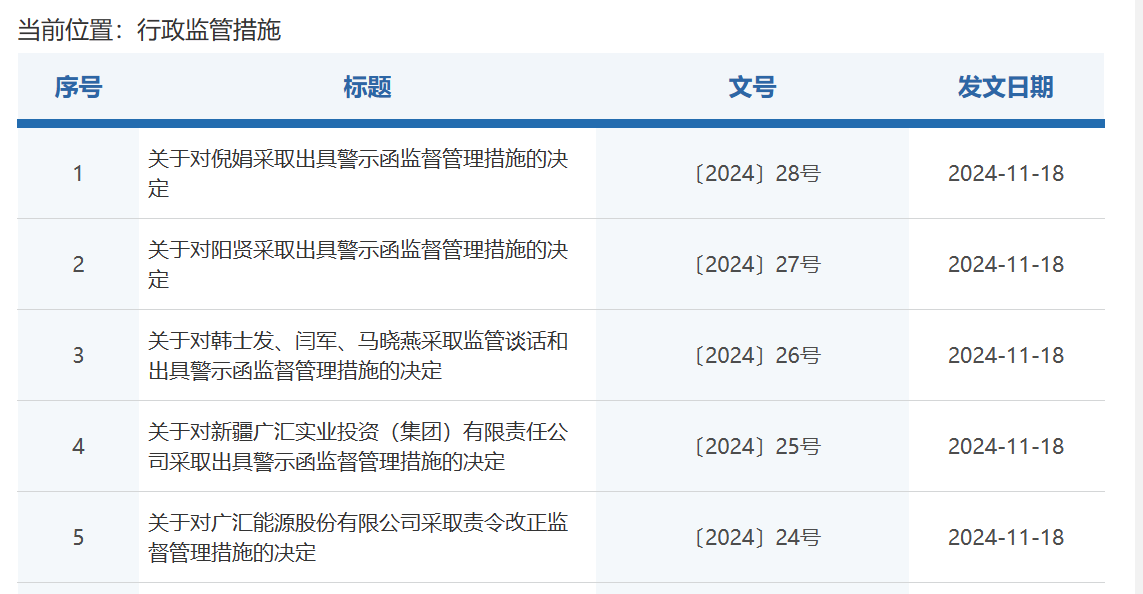 新疆证监局2024年11月18日发布行政监管公告,广汇能源(600256)因存在控股股东及其关联方非经营性资金占用问题,被采取责令改正的监督管理措施。 广汇能源董事长韩士发、时任总经理闫军、财务总监马晓燕、广汇能源现任董事会秘书阳贤、广汇能源时任董事会秘书倪娟分别受到相应警示、监管等处罚。