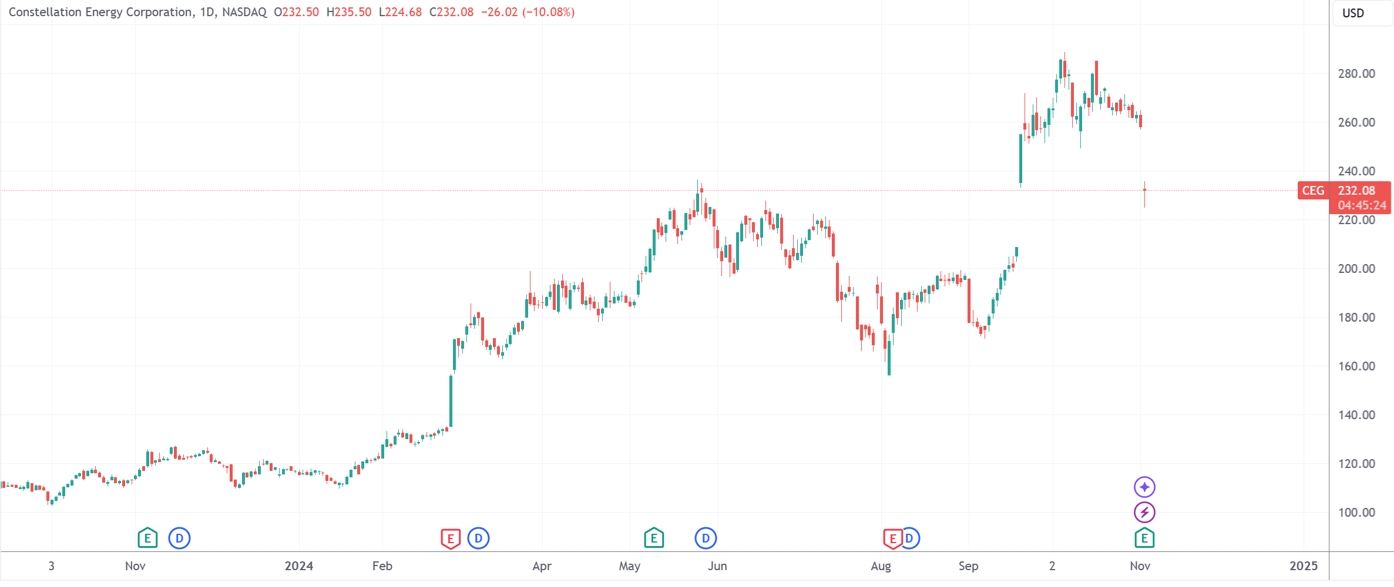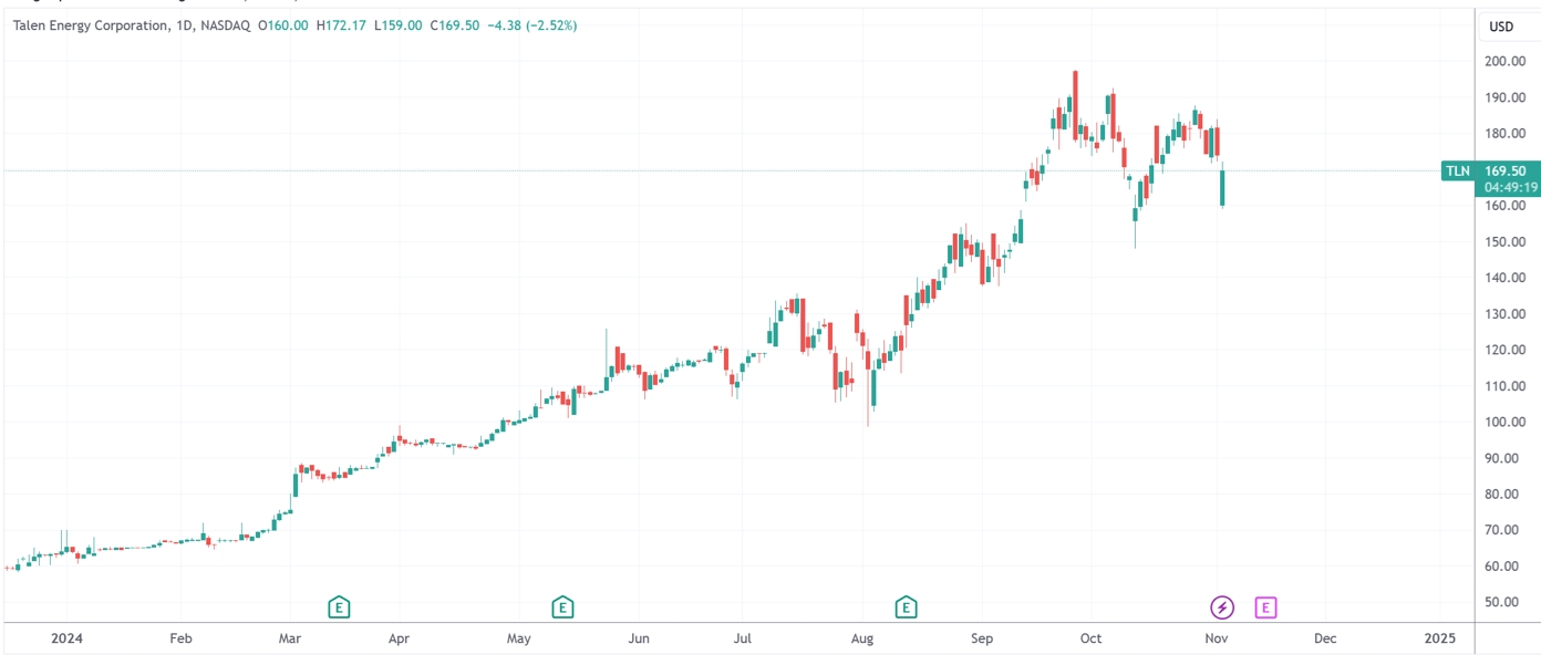 与此同时,同样与“核电数据中心”关系密切的Constellation能源跌超10%。公司在周一盘前报告了好于预期的三季报,并提高了全年利润指引。此前公司股价也在年内完成了翻倍。