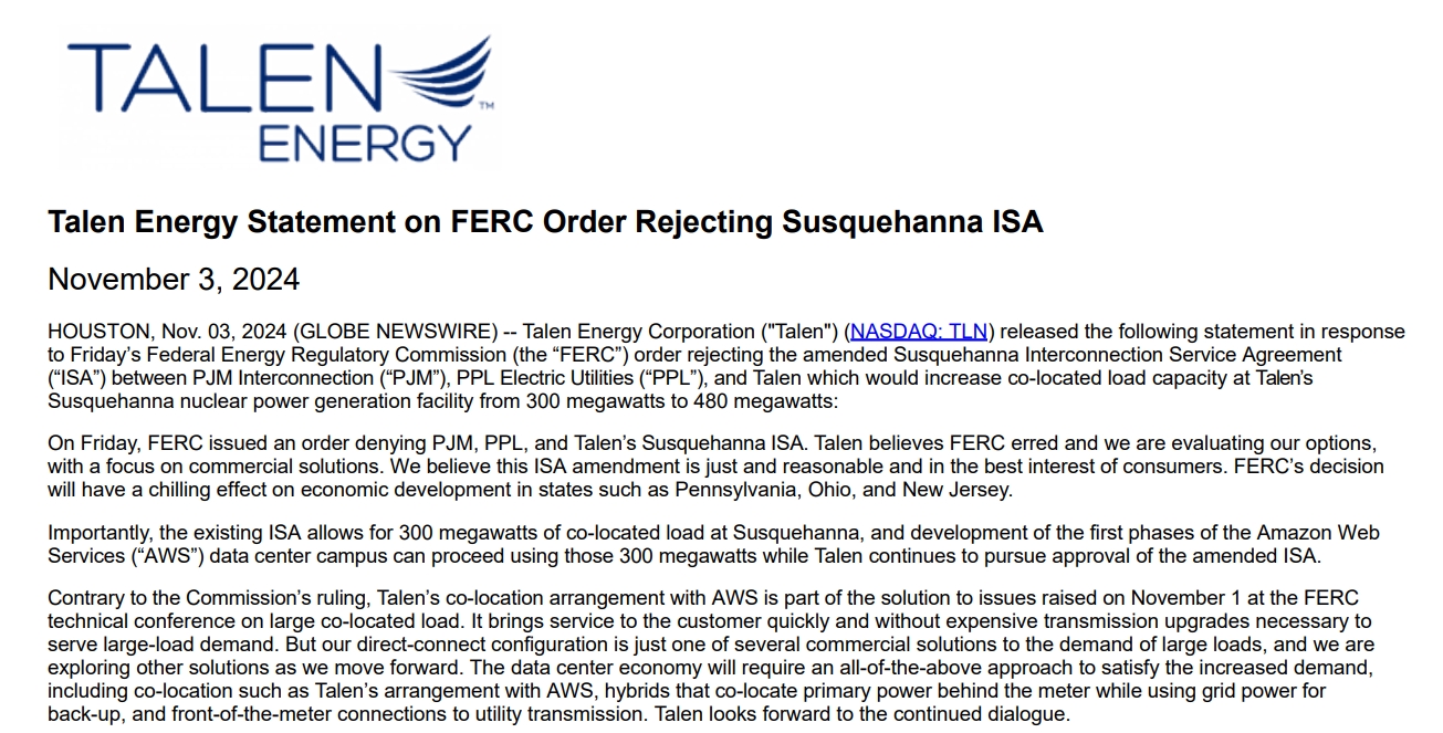 截至发稿,Talen能源在开盘跌近8%后拉升,最新跌幅略超3%。公司在上周日发表声明称,公司认为“FERC犯了错误”,公司正在评估选择,重点关注商业解决方案。公司强调,这种将核电站与数据中心建设在一起的方案符合消费者最佳利益,它能够快速提供服务,并且无需进行昂贵的电网升级来满足大型负荷需求。