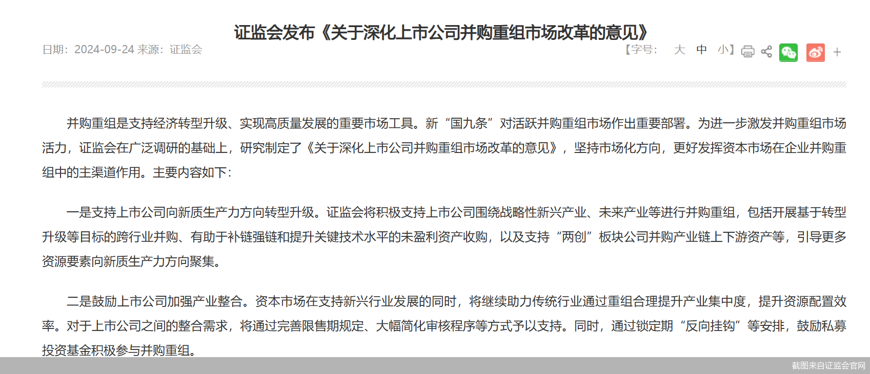在国务院新闻办公室9月24日举行的新闻发布会上,证监会主席吴清透露了多则资本市场未来举措。当日晚间,相关措施迅速落地,证监会官网发布《关于深化上市公司并购重组市场改革的意见》,主要包括六项内容。此外,吴清提及的市值管理指引也在9月24日晚间发布了征求意见稿。