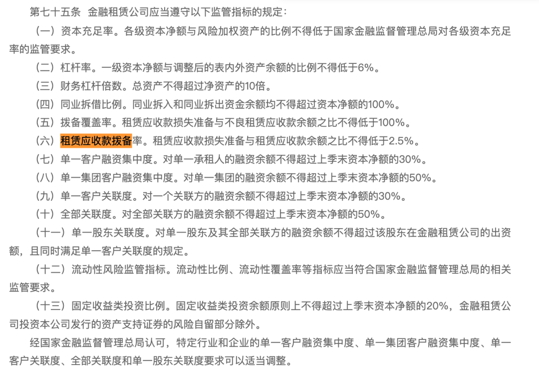 而新增租赁应收款拨备率、流动性比例、流动性覆盖率等指标,则是为了进一步完善监管指标体系。