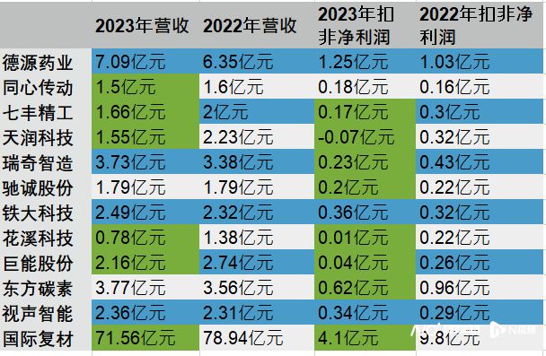 无独有偶,2022年4月15日成功上市的七丰精工(873169.BJ),主营业务为中高端紧固件生产、研发、销售,2023年营收同比下降17%、扣非净利润下降43.33%;2023年4月6日上市的花溪科技(872895.BJ),主业为高端农机(打捆机)研发销售,2023年营收同比下降43.47%、扣非净利润暴跌95.45%;同年5月12日上市的巨能股份(871478.BJ),是金属加工自动化领域专业制造商和集成服务商,2023年营收、扣非净利润同比降幅分别为21.16%、84.61%;2023年12月26日创业板上市的国际复材(301526.SZ),主要产品为玻璃纤维及制品,2023年营收下滑9.34%,扣非净利润则直接腰斩,跌幅58.16%。