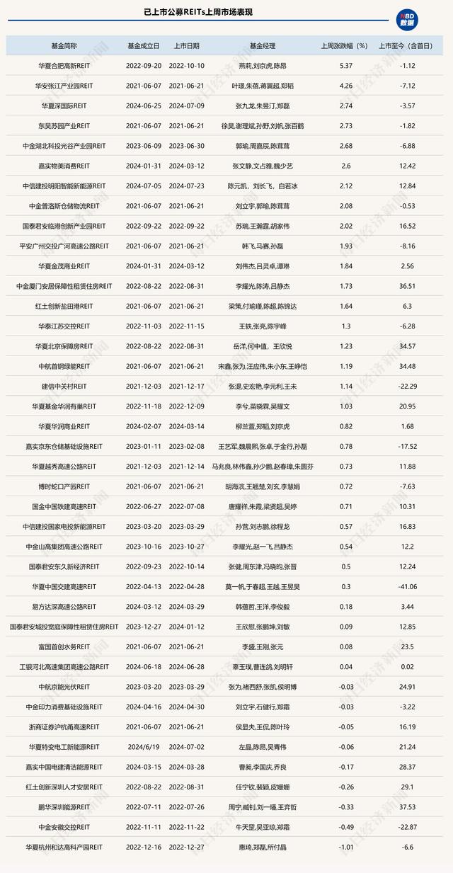 根据Wind数据,截至8月2日,全市场已上市的40只产品中环比上涨的达到31只,其中涨幅最大的是华夏合肥高新REIT、华安张江产业园REIT和华夏深国际REIT,分别上涨了5.37%、4.26%和2.74%。