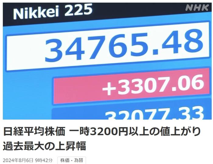 中新网8月6日电 据日本广播协会(NHK)报道,当地时间6日上午,日经指数开盘后全面上涨,一度上涨超过3200点,超过1990年10月的2677.54点,创下有史以来交易时间内的最大涨幅。
