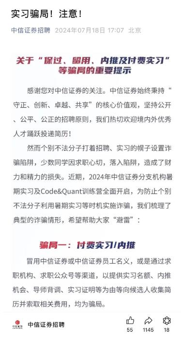 中信证券官方账号发布的提醒