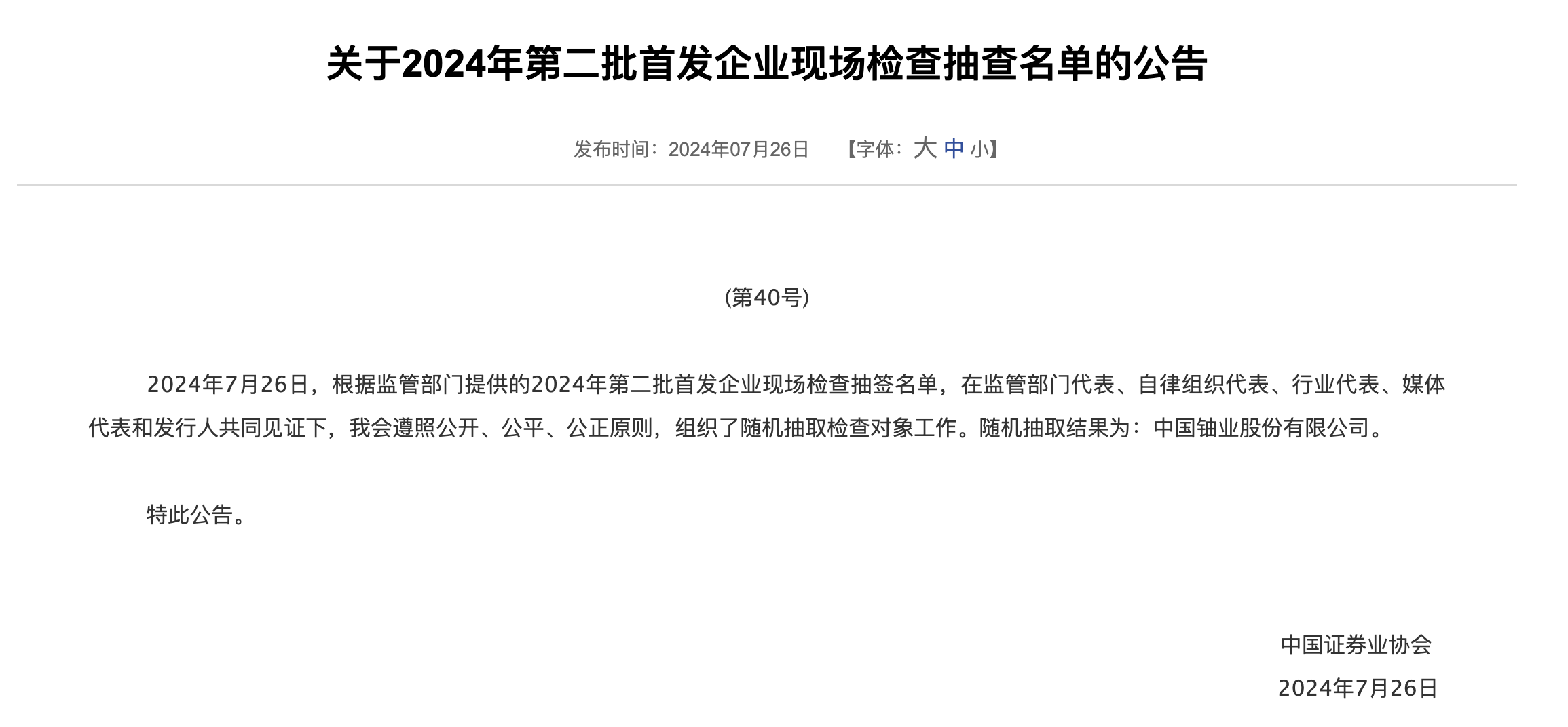7月26日,中国证券业协会公布了2024年第二批首发企业现场检查抽签名单,中国铀业股份有限公司(简称“中国铀业”)被抽中。