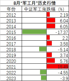 A股素有8月“军工月”的说法。从历史数据来看,从2012年到2023年,中证军工指数在8月份上涨的概率的确更大,但近两年均小幅下跌。