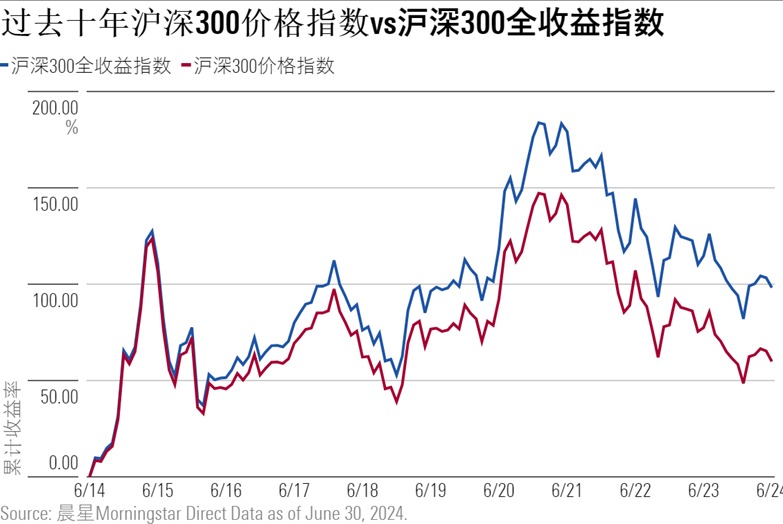 但实际上,有计算显示,如果对比过去十年沪深300全收益指数和沪深300价格指数,计入分红的全收益指数,的确是要比单计算股价涨幅的价格指数表现要强。