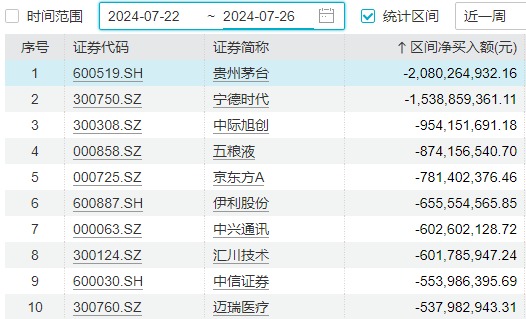 卖出一侧,贵州茅台净卖出额为20.8亿元,宁德时代减仓额为15.39亿元,中际旭创、五粮液、京东方A、伊利股份、中兴通讯、汇川技术净卖出额均超6亿元。