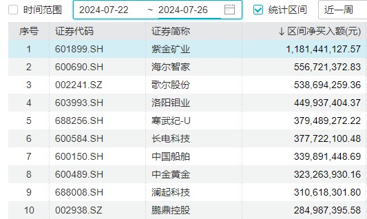 周度表现看,紫金矿业净买入额为11.81亿元,海尔智家、歌尔股份、洛阳钼业加仓额均超4亿元。