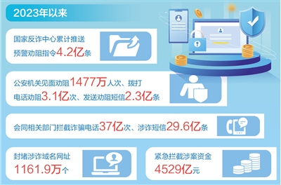 近年来,公安机关大力开展预警劝阻、支付冻结,持续织密筑牢防护网。2023年以来,国家反诈中心累计推送预警劝阻指令4.2亿条,公安机关见面劝阻1477万人次、拨打电话劝阻3.1亿次、发送劝阻短信2.3亿条,会同相关部门拦截诈骗电话37亿次、涉诈短信29.6亿条,封堵涉诈域名网址1161.9万个,紧急拦截涉案资金4529亿元。