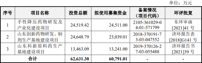 图片来源:施美药业2024年6月29日招股说明书施美药业本次拟发行股份不超3500万股,且不低于本次发行后公司总股本的25%,预计募资额约6.08亿元。公司本次IPO募资拟投资于“手性降压药物研发及产业化建设项目”(2.45亿元)、“山东创新药物研发、制剂生产基地建设项目”(2.3亿元)和“山东科新原料药生产基地建设项目”(1.32亿元)。其中,“山东科新原料药生产基地建设项目”旨在补齐CRO全产业链服务中原料药CDMO产能的缺失。