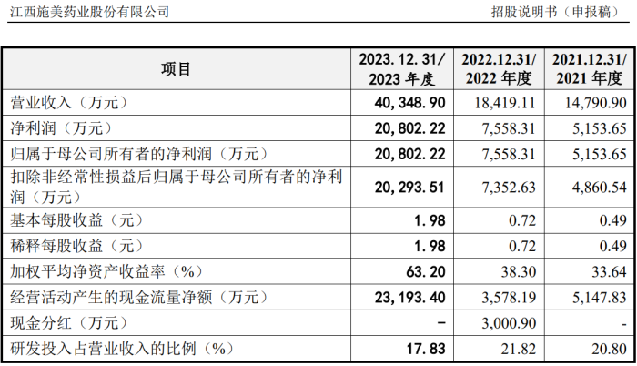 招股书显示,2021年、2022年及2023年(报告期内),施美药业分别实现营业收入14790.9万元、18419.11万元和40348.90万元,年复合增长率为65.17%;归属于母公司股东的净利润分别为5153.65万元、7558.31万元和20802.22万元,年复合增长率为100.91%。