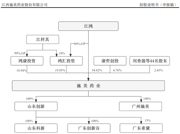 有2名“三类股东”截至招股说明书签署日,江鸿直接持有施美药业5756.2万股,占公司股份总数的54.82%。同时江鸿通过鸿汇投资间接持有公司16.38%的股份。总体上,江鸿直接和间接持有公司71.2%的权益,并担任公司董事长、总经理一职,为公司控股股东、实际控制人。