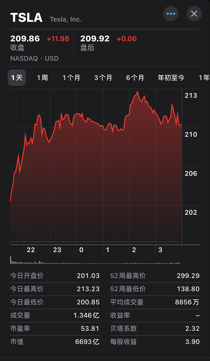中新网7月2日电(中新财经记者 葛成)在中国推出全新购车金融政策后,美东时间7月1日,特斯拉美股上涨6.05%,每股报收209.86美元,股价创近三个月来新高,市值增加382亿美元(约合2788亿元人民币),总市值6693亿美元。