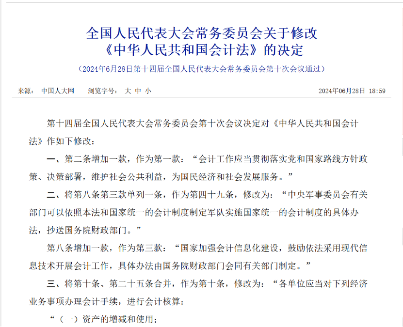 6月28日,十四届全国人大常委会第十次会议表决通过关于修改会计法的决定,自2024年7月1日起施行。