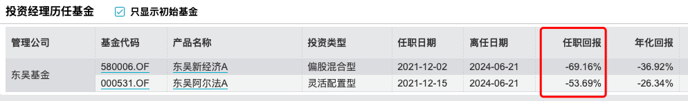 然而,在接下来的两年半时间里,A股市场和基金行业齐齐步入调整期,丁戈管理的这两只产品收益也快速下滑。截至他离任前,东吴新经济任职收益为-69.16%,东吴阿尔法任职收益为-53.69%。