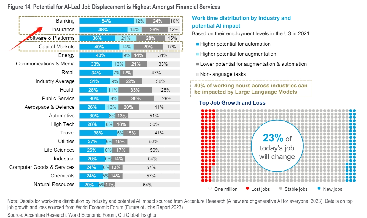 作为这份报告最引人注目的结论,花旗援引世界经济论坛、埃森哲的多项数据和研究称,人工智能对金融业就业岗位的颠覆程度,将会显著高于其他行业。银行、保险和资本市场(行业)中,分别有54%、48%和40%的就业岗位存在“非常高的自动化潜力”。