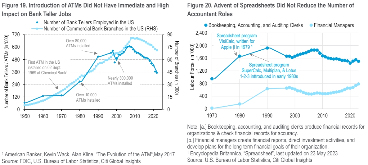 从另一个角度来看,生产力的进步与裁员并不是一一对应的关系。举例而言,美国银行业在1960年代引入了ATM机,但人类柜员的数量在之后的40年里大致处于快速增长的状态,背后的原因是整个美国经济和金融行业保持快速增长。