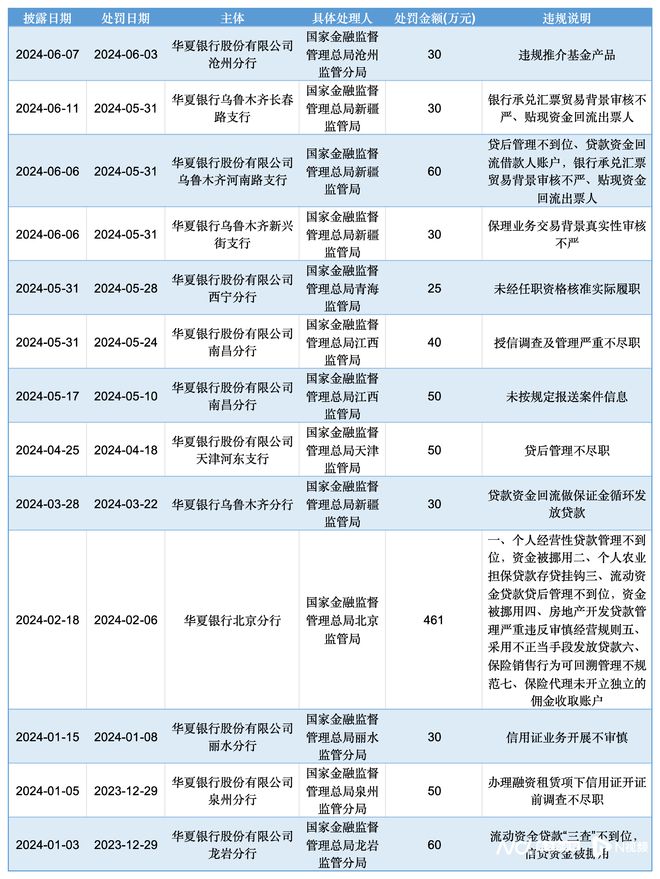 国家金融监督管理总局2024年以来披露的华夏银行罚单。数据来源:同花顺iFinD
