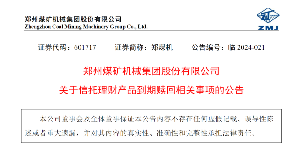 郑煤机在公告中称,为合理利用闲置资金,提高资金使用效率,郑州煤矿机械集团股份有限公司(以下简称“公司”)于2023年5月29日与外贸信托签署了《外贸信托·华软新动力精选1号单一资金信托合同》、《外贸信托·华软新动力精选2号单一资金信托合同》、《外贸信托·华软新动力精选3号单一资金信托合同》,以闲置自有资金30,000万元向外贸信托认购产品,期限为12个月,预期年化收益率为5.00%。