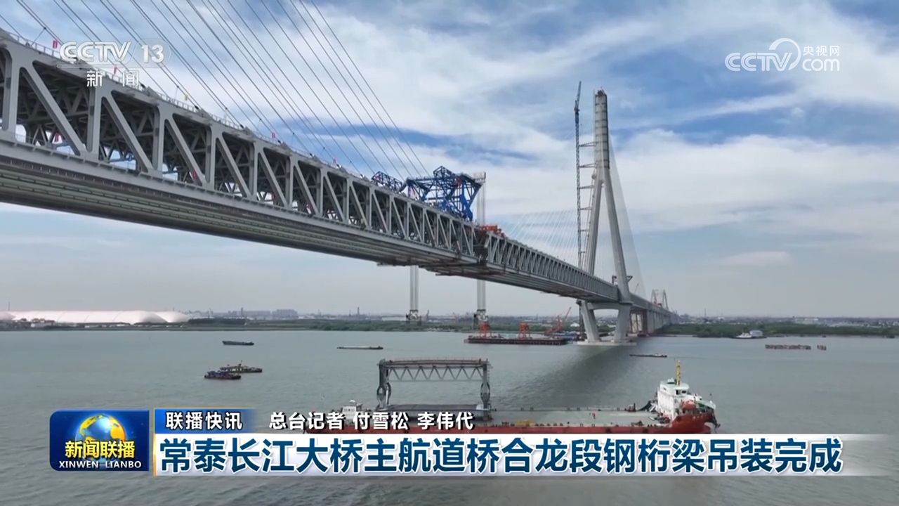 常泰长江大桥主航道桥合龙段钢桁梁吊装完成