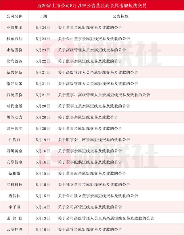 A股上市公司短线交易“扎堆”曝光。截至发稿,据财联社不完全统计,5月以来,包括亚盛集团、和顺石油、永达股份、北汽蓝谷、新兴装备、微导纳米、石英股份、时代出版、川能动力、宏英智能、乔治白、四川黄金、安靠智电、新相微、能科科技、迈信林、李子园、诺普信和云图控股在内的19家上市公司公告董监高亲属违规短线交易。具体详见下图: