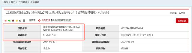 5月17日,北京产权交易所网站显示,江泰保险经纪股份有限公司(简称“江泰保险经纪”)1238.40万股股份(占总股本的5.7619%)再次被上架挂牌转让。股权转让方为中化资本有限公司(简称“中化资本”)。此次信息披露起始日期为2024年5月17日。